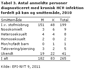 I 2010 blev der anmeldt 265 tilfælde af kronisk HCV-infektion, heraf var 182 (69 %) mænd, tabel 1.