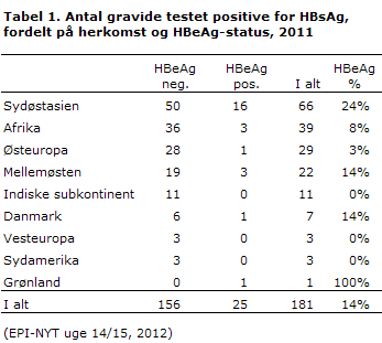 HBeAg, en markør for sygdomsaktivitet, blev påvist hos 25 (14%) af kvinderne. Forekomsten af HBeAg var højest hos kvinder fra Sydøstasien, tabel 1.