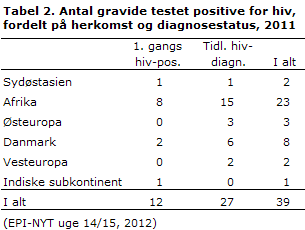 Ud af 63.104 hiv-tests var 39 (0,06%) positive. Tolv kvinder havde ny-påvist hiv og 27 kvinder var kendt hiv-positive. Alle blev anmeldt i det lovpligtige nationale meldesystem for hiv. To af de tolv kvinder med ny-påvist hiv var danskere, tabel 2. Blandt de ti udenlandske kvinder med ny-påvist hiv var fem indvandret for et til tre år siden, én i 2011 og én for 13 år siden; derudover var to turister og én studerende på midlertidigt ophold.